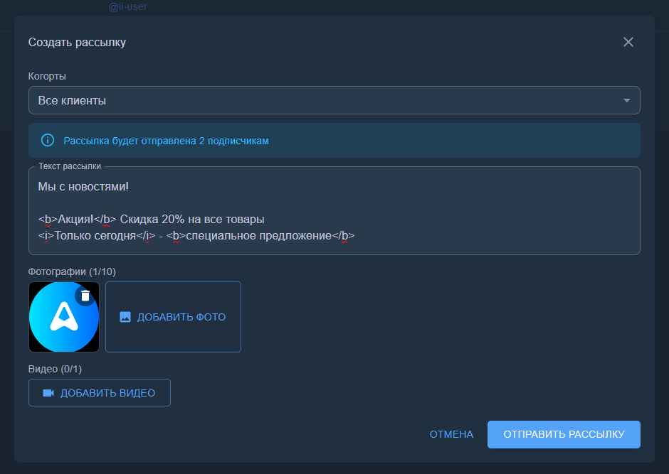 В тексте рассылки доступны прикрепленные фото-видео, кружочки, стикеры и пр. функционал сообщений ТГ. Для фото рекомендуем использовать 1 картинку и текст под ней, поскольку более 1 фотографии будут отправлены отдельными сообщениями.